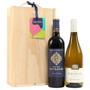 Indulge in refined elegance with our luxury wine gift, presented in a beautifully crafted wooden gift box with a sliding lid. Inside, you'll find the velvety, structured Chateau Puybarbe Côtes de Bourg Bordeaux – a rich Merlot and Cabernet Sauvignon blend showcasing dark berry fruit, cocoa, and silky tannins – paired with the vibrant, mineral-driven Domaine Alexandre Chablis Vieilles Vignes, offering crisp green apple, flinty zest, and delicate complexity. This thoughtfully curated duo is ideal for festive dinners, anniversaries, or as a standout Christmas wine gift for friends, family, or clients.