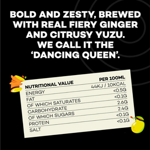 Water, Black Tea, Green Tea, Cane Sugar, Kombucha Culture, Ginger juice, Yuzu Juice, Lemon Juice, Living Cultures (Bacillus Coagulans)
