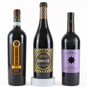 While all three wines share the hallmark Appassimento richness, they each bring a distinct regional twist. Neropasso impresses with its dense, chocolaty depth from the north; Baglio U...Passimiento offers a fruit-forward, softer Sicilian style; and Pirovano’s Salento Rosso provides a fresher, slightly lighter southern profile with a nutty finish. Together, they make a versatile set to enjoy alone or with varied dishes.