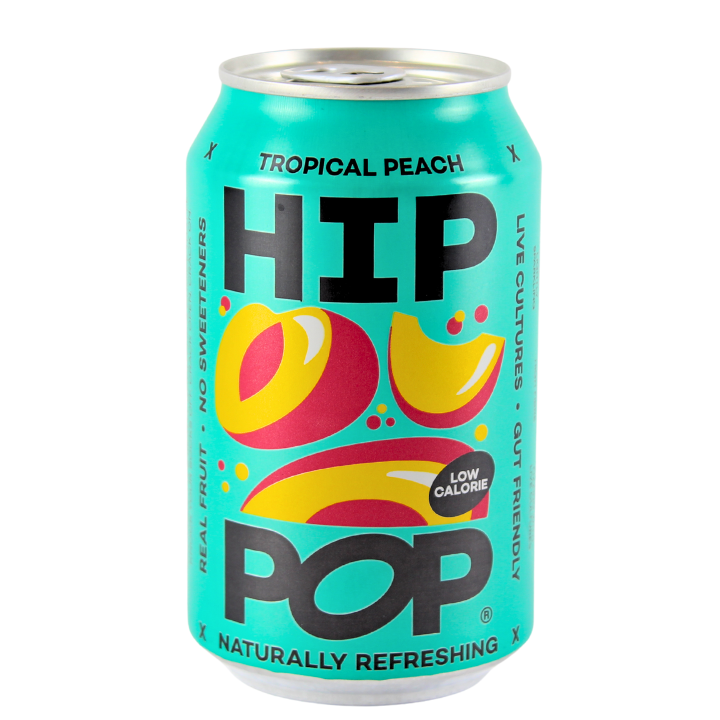 Instead of fermenting tea like traditional kombucha, Hip Pop Living Soda is blended cold with real fruit juices (peach, mango, pineapple) and natural flavourings – no caffeine, no weird aftertaste, and no artificial sweeteners like stevia or aspartame.