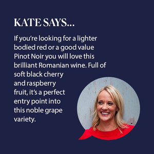 "If you're looking for a lighter bodied red or a good value Pinot Noir you will love this brilliant Romanian wine. Full of soft black cherry and raspberry fruit, it's a perfect entry point into this noble grape variety."