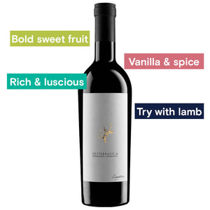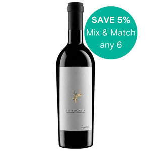 Cantine Sampietrana Settebraccia is a powerful blend of Negroamaro and Susumaniello that delivers intense fruit character balanced with warm, savoury spice. Deep ruby in colour with aromas of jammy black fruits, vanilla, clove, and subtle hints of spice. On the palate, it’s full-bodied and rounded, with rich flavours of black cherry, plum, and baked berry, supported by soft tannins and a warm, velvety texture. Finishes long and lingering with a touch of oak and a hint of savoury spice. This southern Italian red combines traditional bush-vine cultivation with careful oak ageing, making it a perfect choice for hearty meals or slow, relaxed evenings